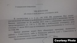 Письма об отказе датированы июлем месяцем, но получены были лишь в сентябре. По словам Неганова, таким образом силовики пытаются препятствовать обжалованию таких отказных материалов в прокуратуре Севастополя в связи с истечением сроков обжалования.