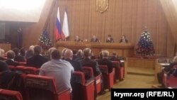 ​Как передает корреспондент Крым.Реалии, в зале заседаний, где в среду, 10 декабря, проходила сессия, уже стоят две елки – одна украшена шарами в цветах флага Крыма, вторая – российского триколора, на стенах зала – бумажные снежинки.