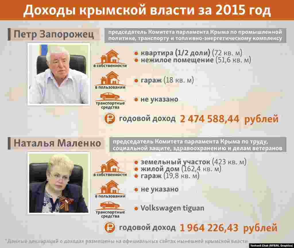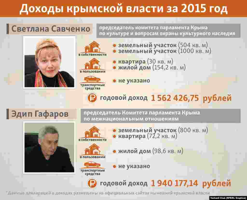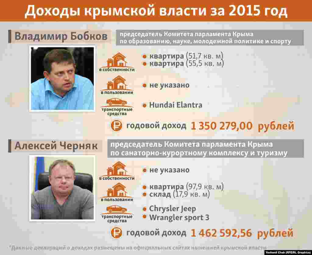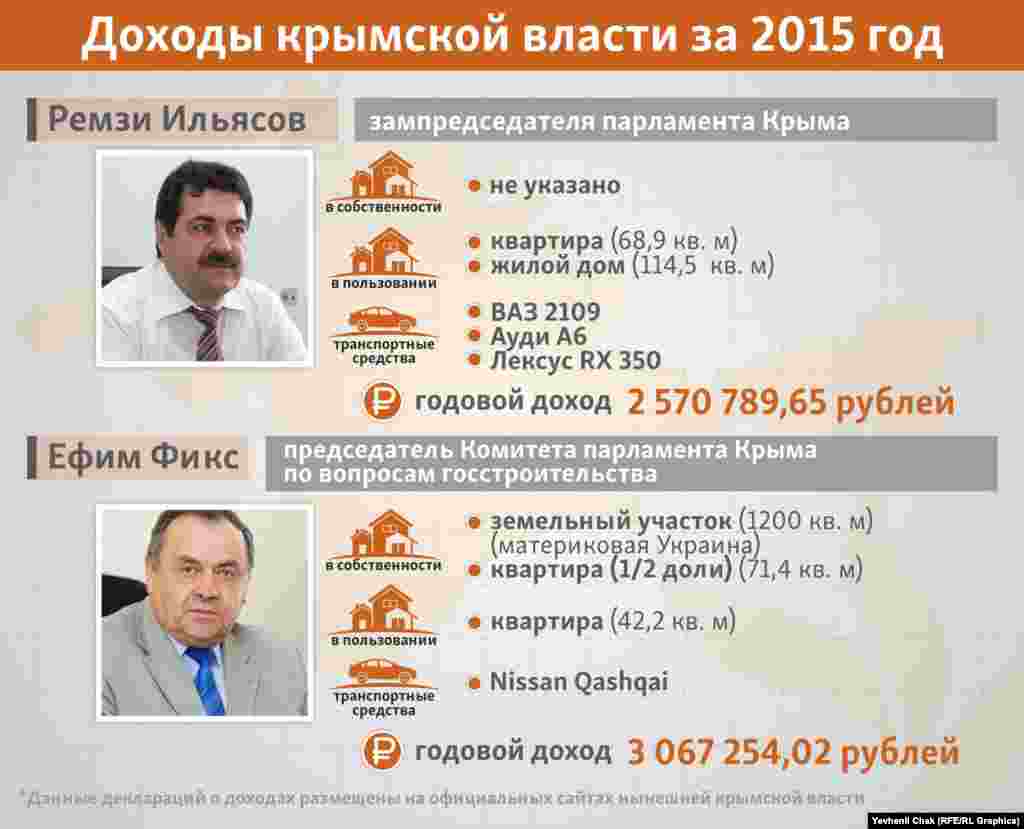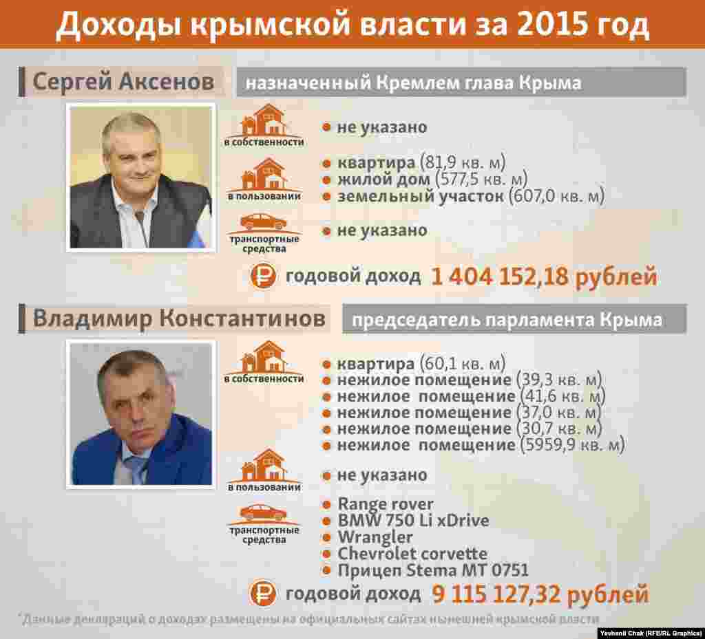 Подконтрольные России крымские власти обнародовали информацию о своих доходах и имуществе за 2015 год. Предлагаем ознакомиться, чем официально владеют крымские чиновники и во сколько они обходятся налогоплательщикам.