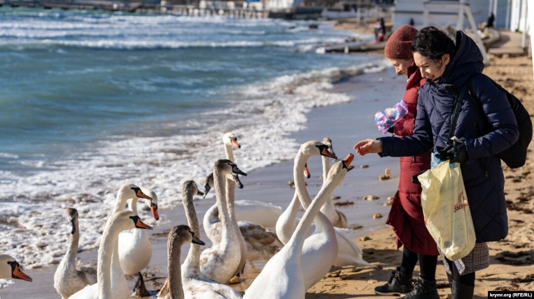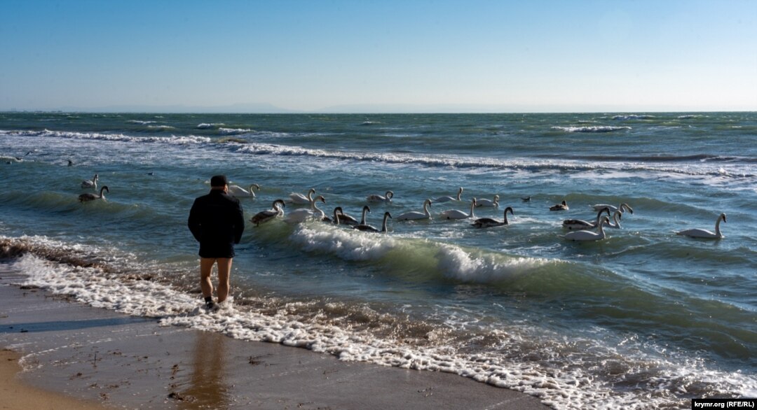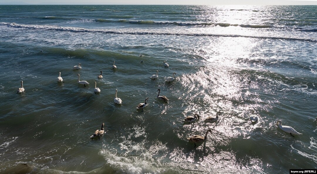 Лебеди-шипуны в зимнюю пору в традиционно «перебазируются» с соленого озера Сасык-Сиваш в район более многолюдной городской пляжной зоны