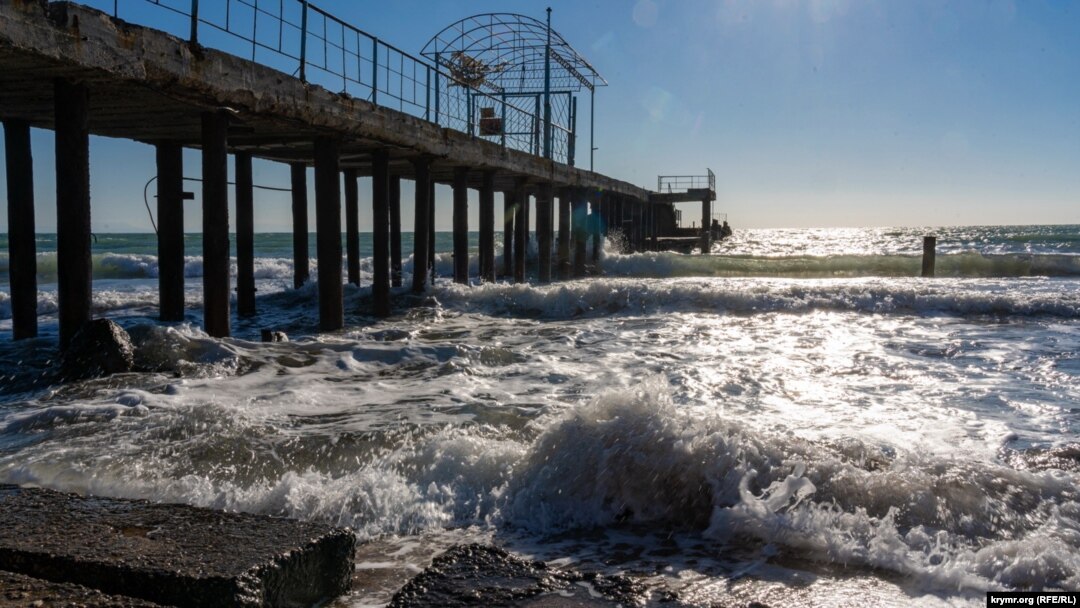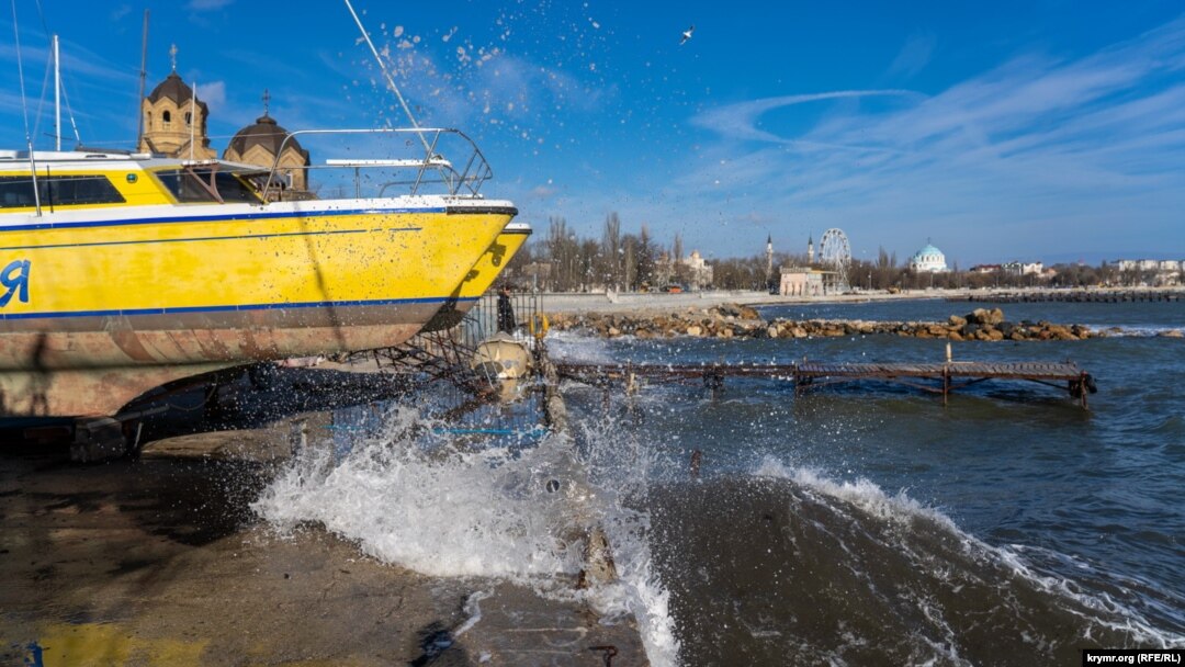 Брызги моря на причале городского яхт-клуба. За яхтой виднеются купола Ильинской православной церкви Московского патриархата. А справа в небе – инверсионная «петля» от реактивного самолета