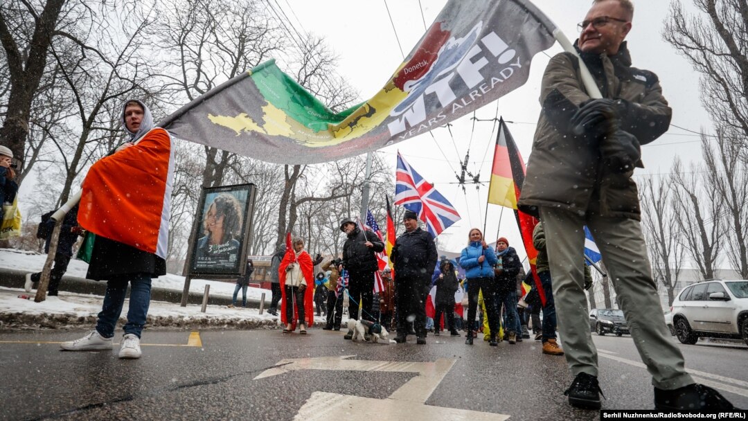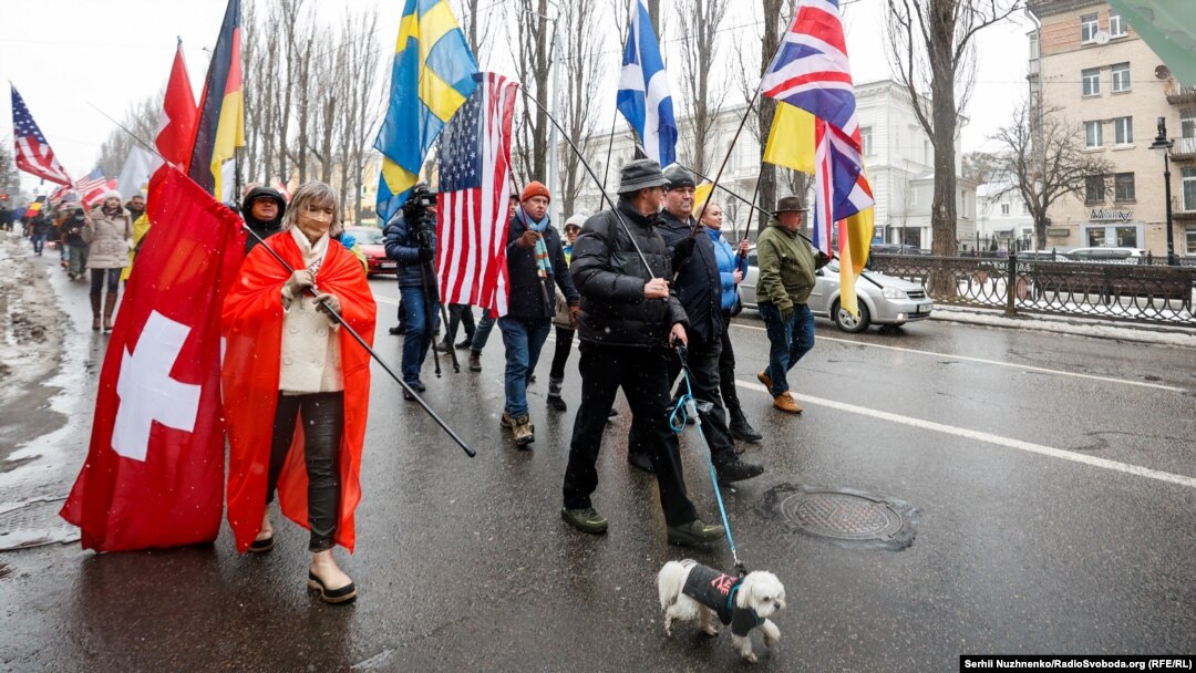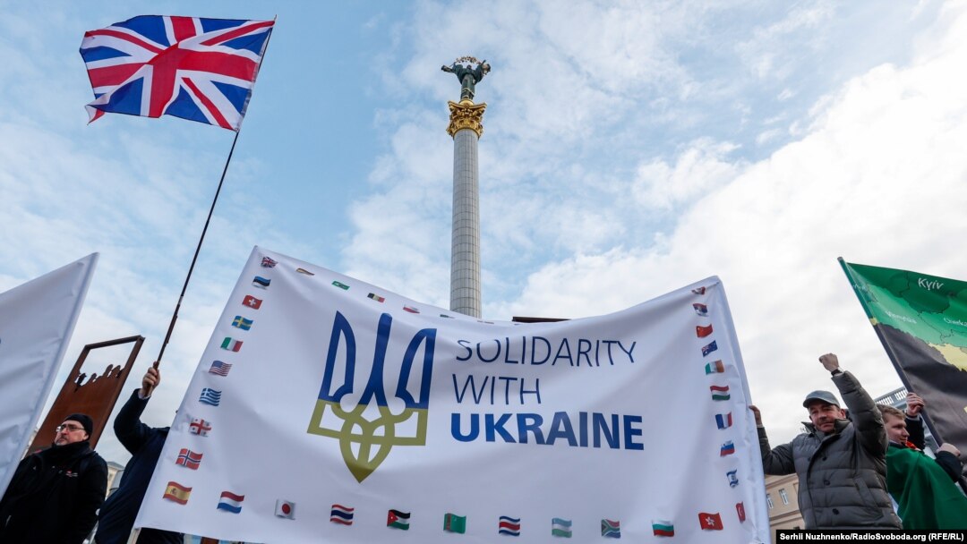 В центре Киева прошла акция в поддержку Украины, которая противостоит российской агрессии и находится под угрозой нового вторжения.